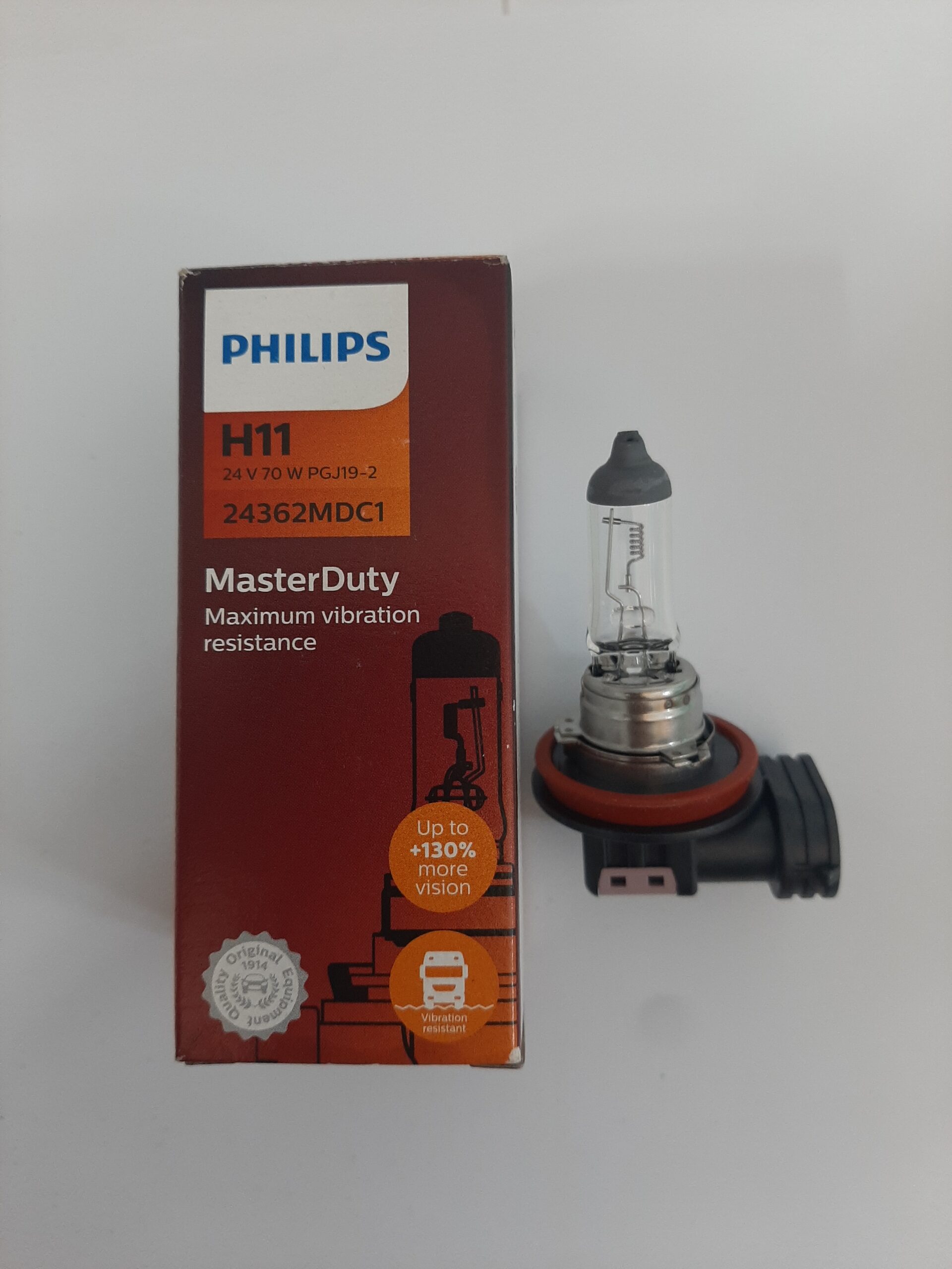 لامپ H11 با ولتاژ ۲۴ ولت و توان مصرفی ۷۰ وات دارای رنگ نوری آفتابی محصولی از شرکت فیلیپس می باشد. مدل این لامپ آلمانی MasterDuty با افزایش روشنایی ۱۳۰درصدی است. همچنین باتوجه به لرزش خودروهای سنگین در جاده ؛ تنگستن این لامپ ضدلرزش طراحی شده و دربرابر تکان های شدید مقام است.
